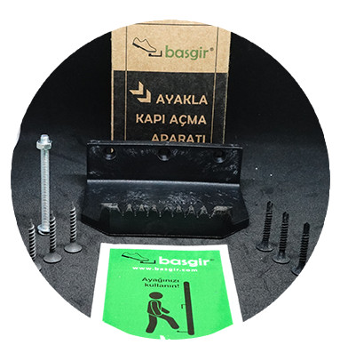 Ellerinizi kullanmadan, ayağınızla basarak kolayca kapıyı açıp geçebileceğiniz Basgir® Ayakla Kapı Açma Aparatını kapınıza kolayca monte edebilirsiniz.
